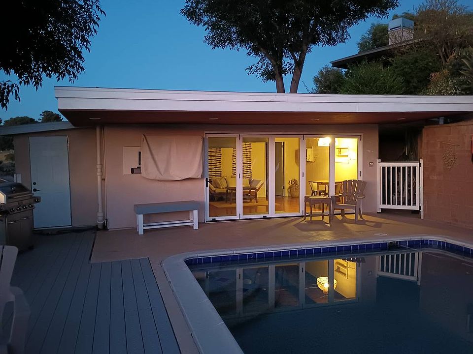 Bright open layout with modern furniture, real wood floors, and mid-century details. Full kitchen, washer/dryer for small medium loads, and good storage. Luxury touches, granite countertops, tile shower, gas fire table, outdoor living areas.