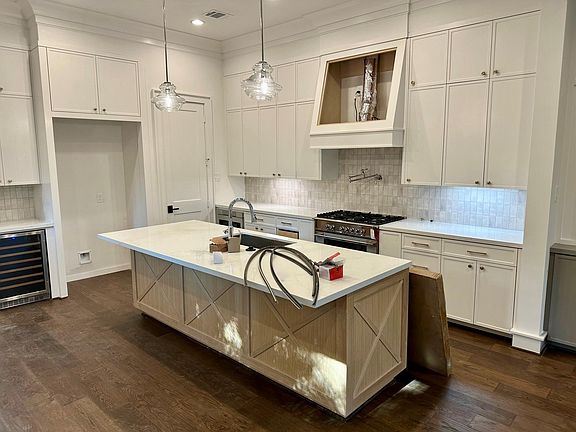 Engineered wood floorsOpen-concept livingWine refrigeratorCustom kitchen cabinetryCustom-designed tile