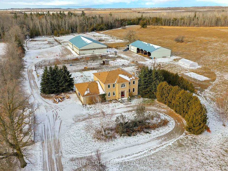 Nestled on 130+ breathtaking acres in the heart of the Kawarthas abutting Goose Lake and protected wetlands, 30 acres of which is cleared, planted with hay, this exceptional equestrian estate offers the ultimate blend of luxurious country living and horse facilities. The elegant custom residence spans over 3,000 sq. ft. and welcomes you with a grand foyer and sweeping staircase. Bright, spacious principal rooms include a formal dining room, a large country kitchen with walk-out decks overlooking paddocks and the arena, an elegant family room warmed by a wood-burning fireplace and attached 3 car garage. The private primary suite is a serene retreat, featuring panoramic views of the entire equestrian operation, two ample walk-in closets, and a luxurious 5-piece ensuite. The lower level adds a generous recreation room with wood stove, rough-in for a future 3-piece, a versatile bonus room and convenient wine cellar/cold storage. Designed for the serious equestrian, the property boasts a state-of-the-art indoor riding arena with viewing lounge, an impeccable 8-stall barn, also a heated and insulated workshop/driveshed for hay and equipment storage with 3-piece bath. Both outbuildings have been thoughtfully constructed to accommodate future solar installation and off-grid potential. Miles of private trails wind through mature forests, perfect for riding, spending time in the cabin with loft, or simply escaping into nature. Complete with reassuring pre-list home inspection.