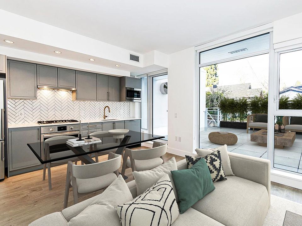 A Rare Urban Gem! This unique 1 Bedroom + Den residence features an expansive 200 sq ft patio perfect for entertaining and dog owners. Enjoy the convenience of a private Townhouse-style entry on the quiet side of the building, offering comfort and privacy. Step inside to a thoughtfully designed interior complete with AC, sleek laminate flooring, premium BOSCH kitchen boasting a 5-burner gas cooktop and more. Enjoy the spa-inspired bathroom with soaker tub and built-in vanity shelving. Located in Norquay Village, steps from SkyTrain, T&T, Shoppers and a quick bus ride to Downtown. Enjoy first-class amenities: rooftop garden, BBQ area, fitness center, and residents’ lounge with kitchen. 1 Parking inc. Rentals and 2 pets allowed. OPEN HOUSE Sat Nov 8, 2-4PM!