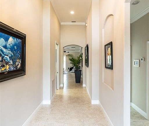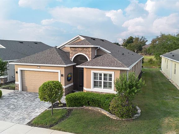 Welcome to this exquisite waterfront residence, a stunning 3-bedroom, 2-bath home nestled in a coveted 55+ community in Central Florida. This elegant property features a beautifully pavered driveway and walkway, complemented by a private back patio and pathway that leads directly to the serene lakefront. Upon entering, you’ll immediately appreciate the spacious open foyer, showcasing premium upgrades throughout the home. The expansive living area is highlighted by elegant tile flooring, soaring ceilings, crown molding, and a striking coffered tray ceiling that adds a touch of sophistication. A large glass pocket door seamlessly connects the living room to the lanai, which features versatile sliding glass windows. These can be opened to allow for a refreshing breeze or closed to enjoy the peaceful water views from the comfort of your home. A granite countertop in the lanai provides additional space for both cooking and planting. The kitchen is a true centerpiece, featuring sleek granite countertops, dark wood cabinetry with pull-out drawers and soft-close mechanisms, as well as top-of-the-line stainless steel appliances. The master suite offers direct access to the back lanai and boasts sweeping views of the water and an island in the distance. Both walk-in closets have been meticulously designed with custom built-ins for optimal storage, while the master bath features dual sinks set in a wide granite countertop and a spacious walk-in shower. Two additional guest rooms, situated at the front of the home, share a well-appointed guest bath. Throughout, the home offers an array of upgrades beyond the builder’s standard features, ensuring both comfort and style. Located within the prestigious Lakes of Mount Dora, this active 55+ community offers an 18,000 sq. ft. clubhouse, featuring a library, billiards room, card/game room, social hall, gym, and arts and crafts room—perfect for socializing and relaxation. The community’s 4 miles of interconnected waterways are ideal for kayaking, canoeing, paddle boating, and trolling motor boats. For those who enjoy sports, the amenities include pickleball and tennis courts, bocce ball, Cor Hole and croquet lawns, as well as a resort-style pool and hot tub. Walking trails and a fire pit complete the outdoor experience. Additionally, the community provides convenient fenced and gated RV/boat parking, as well as reclaimed water lawn irrigation and internet/cable, all included in the low monthly fee of $280. This home is just a 15-minute drive from the charming downtown Mount Dora, a picturesque town known for its art, festivals, unique shopping, and delightful eateries. Enjoy breathtaking sunsets over Lake Dora, and with Orlando less than an hour away, you’re in close proximity to world-renowned attractions such as Disney World, Universal Studios, Dr. Phillips Center for the Performing Arts, and much more. The beach is also a short one-hour drive away. Experience the perfect blend of luxury, comfort, and convenience in this remarkable lakeside home.