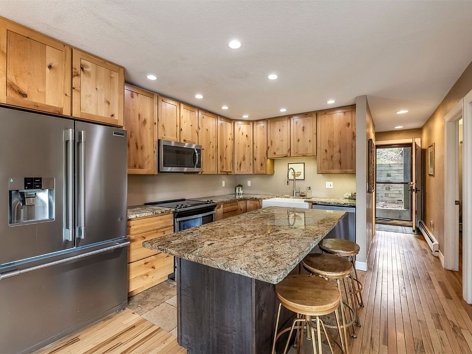 Discover your perfect mountain retreat in this delightful 2-bedroom, 1-bath condo, with dedicated carport & storage closet for all your outdoor gear! Ideally situated in the vibrant heart of Silverthorne. Surrounded by scenic trails and nestled among towering pines, this home offers the best of mountain living with comfort, convenience, and style. Inside, you'll find a bright & airy living room, beautiful hardwood floors & a thoughtfully updated kitchen featuring stainless steel appliances, granite countertops, and a breakfast bar—perfect for everything from quick weekday meals to relaxing après-ski evenings. Step out onto the private deck to soak in the crisp alpine air, ideal for morning coffee or unwinding after a day of adventure. Enjoy easy access to world-class skiing at Keystone, Breckenridge, Copper Mountain, and A-Basin, plus endless opportunities for hiking, biking, and fishing right outside your door. Enjoy nearby Silverthorne’s shops, restaurants, and the new performing arts center just down the hill. With low-maintenance living and a location that caters to both everyday convenience and year-round adventure, this charming condo is the perfect place to call home.