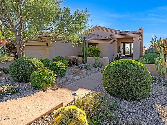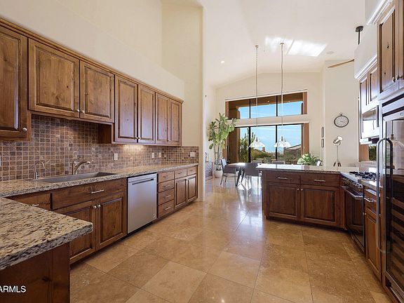 Fantastic find in gated Whispering Ridge at Troon Village! Meticulously maintained, beautifully updated, and move-in ready! The open and airy floor plan showcases large view windows that frame the stunning desert surroundings and low-maintenance backyard with an infinity-edge play pool, all set against a backdrop of city lights, sunsets and Pinnacle Peak mountain views. The great room's stacked-stone gas fireplace, flanked by custom built-ins, creates a warm focal point while seamlessly connecting to the dining area and kitchen for easy entertaining. The kitchen features richly stained wood cabinetry, granite counters, a stainless steel appliance package with gas range, newer Bosch stove and microwave, wine refrigerator, and a stylish tile backsplash. The adjacent dining area opens to the patio for perfect indoor/outdoor living. The refinished front door and flooring enhance the home's overall charm.