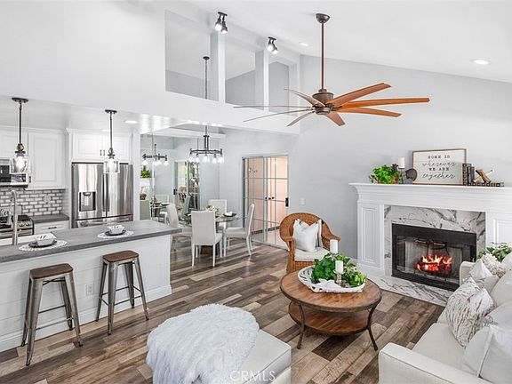 Welcome Home to this Beautiful 2 story condo with Vaulted ceilings and Remodeled Kitchen. This is the largest floorplan in the highly coveted Briosa community of Laguna Hills. This updated home features luxury vinyl flooring, all new paint, carpet, light fixtures, ceiling fans, recessed lighting, gas fireplace with marble surround and designer mantle. The showstopper is the Stunning Remodeled Kitchen with high end stainless steel appliances, marble backsplash and designer fixtures. Features include a loft (for office or playroom), ample storage, indoor laundry room, large balcony, and is conveniently located across from the community pool and mailboxes. A one car detached garage is included as is 1 reserved parking spot. The Briosa community has its own park/playground and lots of green space. It is perfectly located near the 73 toll road, shopping, restaurants, schools, horse trails, and just short drive to the beach and so much more. HOA dues include trash and water.
