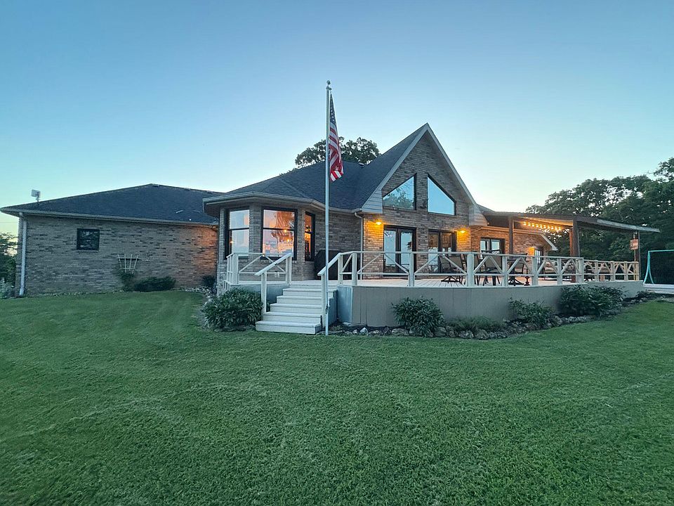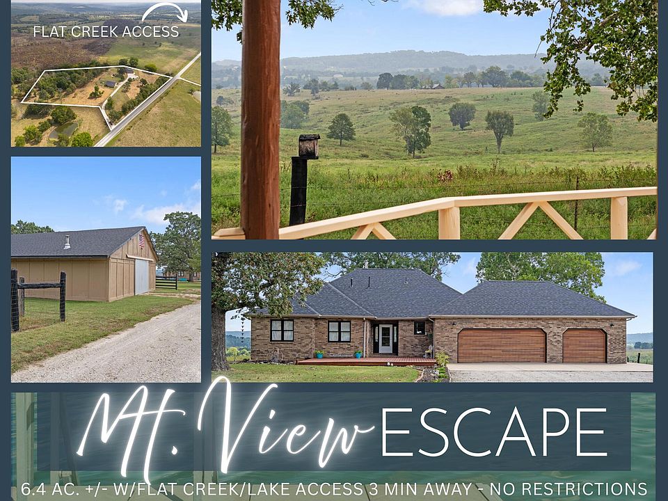 Experience supremely private, exceptional country living w/all of the modern comforts in this 3,800 sq. ft. custom-designed home (2,800 finished) perfectly set on 6.41 ac +/ (NO RESTRICTIONS) mixed gently rolling pasture land w/mature towering hardwoods. Enjoy breathtaking eastern-facing views from the expansive deck, where the Primary Suite, Living Room, Dining, & Kitchen all have direct access. Property Highlights Include: 6.41 unrestricted acres, 36' x 48' shop & 4-stall horse barn (w/water & electric)50-amp RV hookup & cemented hot tub pad with 220 outlet. 600 sq. ft. of deck space (256 sq. ft. covered) w/wide-open views. Hardwood floors throughout, anchored by a cozy propane gas fireplace. Spacious kitchen w/double ovens, 5-burner propane cooktop (electric hookup still available), built-in microwave & new sink/faucet. Primary suite & guest bedrooms w/hardwood flooring. 800+ sq. ft. of climate-controlled unfinished storage/additional living space, in-law suite or more bedrooms. Renovations & Upgrades2017 Include: Full electrical re-wire, water softener system, new lighting, primary suite remodel, new hardwoods, taller toilets, driveway gate alarm2021: Preventive French drain & sump pumps, 20' x 25' front porch deck, UV film on eastern windows, new garage doors & motors, new lower-level flooring2022: New propane 5-burner cooktop & vent2023: New roof on home & barn (30-yr shingles), skylight replacement, new kitchen sink & faucets. Location is super duper convenient: 3 min. to Flat Creek access for floating, 15 min. to Table Rock Lake access, 40 min. to Branson, and only 50 min. to Springfield. This property blends comfort, convenience, practicality, breathtaking sunrise mt. views, no restrictions & perfect for horse enthusiasts, hobby farmers, outdoor adventurers, or anyone seeking a peaceful retreat w/all of today's coveted HGTV upgrades. Saddle up & escape to the country & #tablerocklake (3rd party boat slips available). Don't forget to watch the video (o: