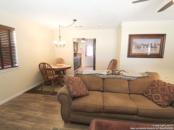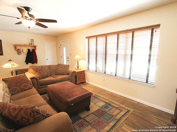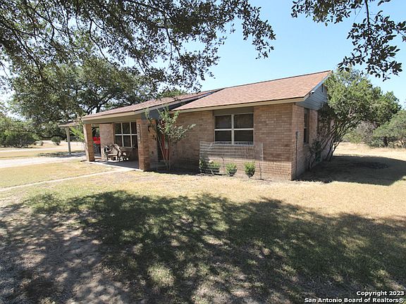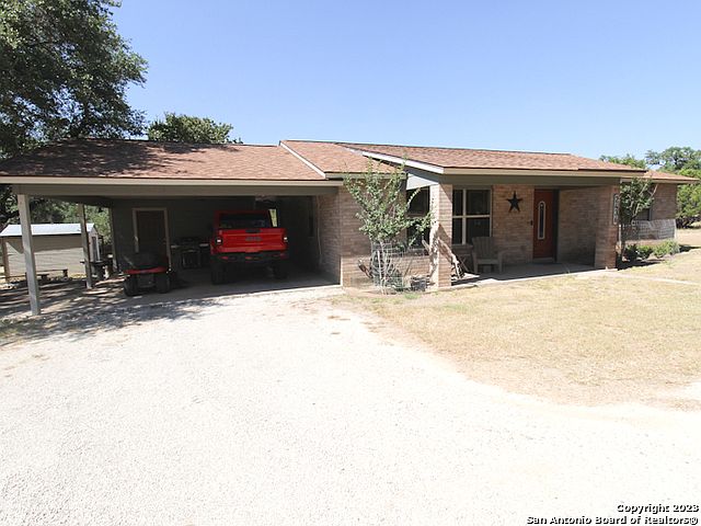 A little slice of the Hill Country! This Texas Ranch beauty is perfectly placed on a level 1 acre lot with tons of mature trees and a circular driveway for your convenience. Enter the home into the large, comfortable living area featuring huge windows to bring in the outdoors. Work your way through the dining area into the beautiful, well-appointed kitchen. Kitchen offers tons of cabinet space, stunning counters and backsplash, matching stainless appliances and easy access to the laundry room (washer and dryer included). On the opposite side of the home you will find 3 spacious bedrooms. Primary is large and airy with a perfectly located ensuite. The secondary bedrooms share a roomy guest bathroom. Quartz counters throughout, custom tile, roof replaced 2022, water heater 2022, breaker box 2022, Husqvarna riding mower conveys. Don't forget to walk the beautiful lot, check out the great fire-pit area and all the extra storage with plenty of room for RV parking also.