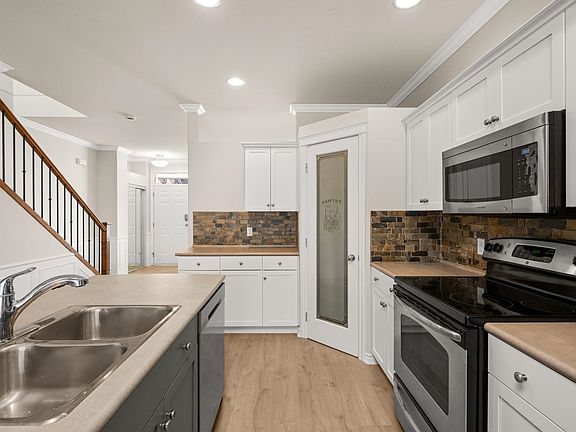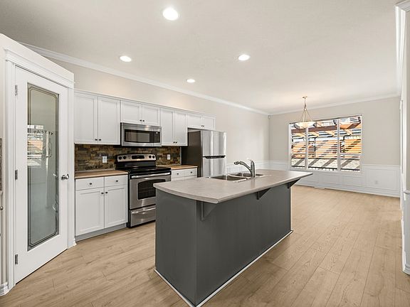 New flooringCozy gas fireplaceUpdated kitchenOpen dining areaFlex roomStylish fenced backyardStone privacy wall