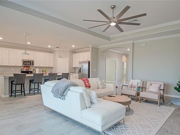 Wake up to a serene sunrise over the water every morning on the patio of this rarely available Summerville II model in Orange Blossom Ranch! Built in 2022, this 3+den, 3 bath, 3 car garage home shows as if it was never lived in! The French door entry welcomes you into an open concept galley kitchen topped with quartz everywhere, a huge island for those who love to entertain and cook, tile throughout the home in immaculate condition, keeping your new home dreams alive without waiting to build! The private owner's suite, offering giant his & hers closets, is tucked in the back of the home, keeping the privacy in tact while the 2 guest beds and study sit at the front. This model, complete with the extra garage bay with EV charging, is the ideal space for your work-from-home family or the family with all the toys! The oversized lot caps it off with plenty of room for your custom pool or desire to add landscaping all-around! The OBR area is bustling with new shops and commerce under construction right next door, Collier County's biggest park adjacent, A-rated schools a mile away, and robust amenities inside the gate for endless entertainment! You don't want to miss this one!