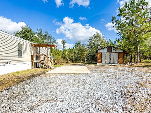 Looking for peaceful country living with room to roam? This inviting property offers the perfect blend of comfort and space. Surrounded by neighboring acreage, it provides a quiet setting with a mix of open areas and shaded trails that wind throughout the land—ideal for walking, exploring, or simply enjoying the outdoors. The home welcomes you with a spacious covered front porch featuring custom shades, creating a comfortable spot to relax and take in the scenery. Inside, you'll find a split floor plan with an open concept kitchen and living area. Additional outdoor highlights include a storage building with a concrete foundation, a large workshop with oversized doors and a concrete base—perfect for equipment storage—and a concrete parking pad. Whether you're seeking a peaceful full-time residence or a weekend getaway, this property offers a wonderful opportunity to enjoy the beauty of country life while remaining just a 45-minute drive from the white-sand beaches of Panama City Beach.