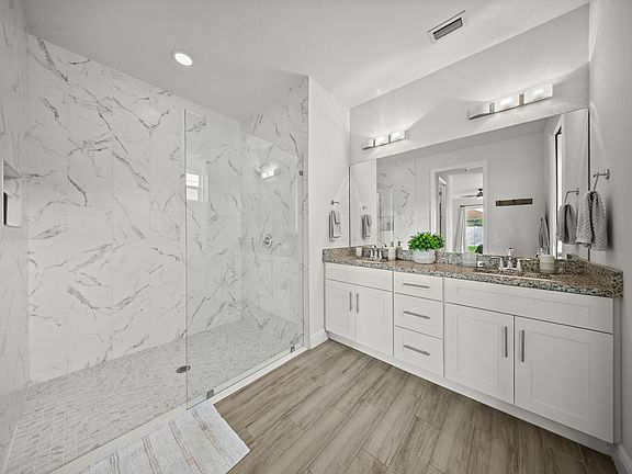 Granite countertopsOversized laundry roomSleek contemporary bathroomCrisp white vinyl fencingOpen-concept layoutClean modern finishesSpacious primary suite