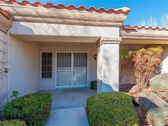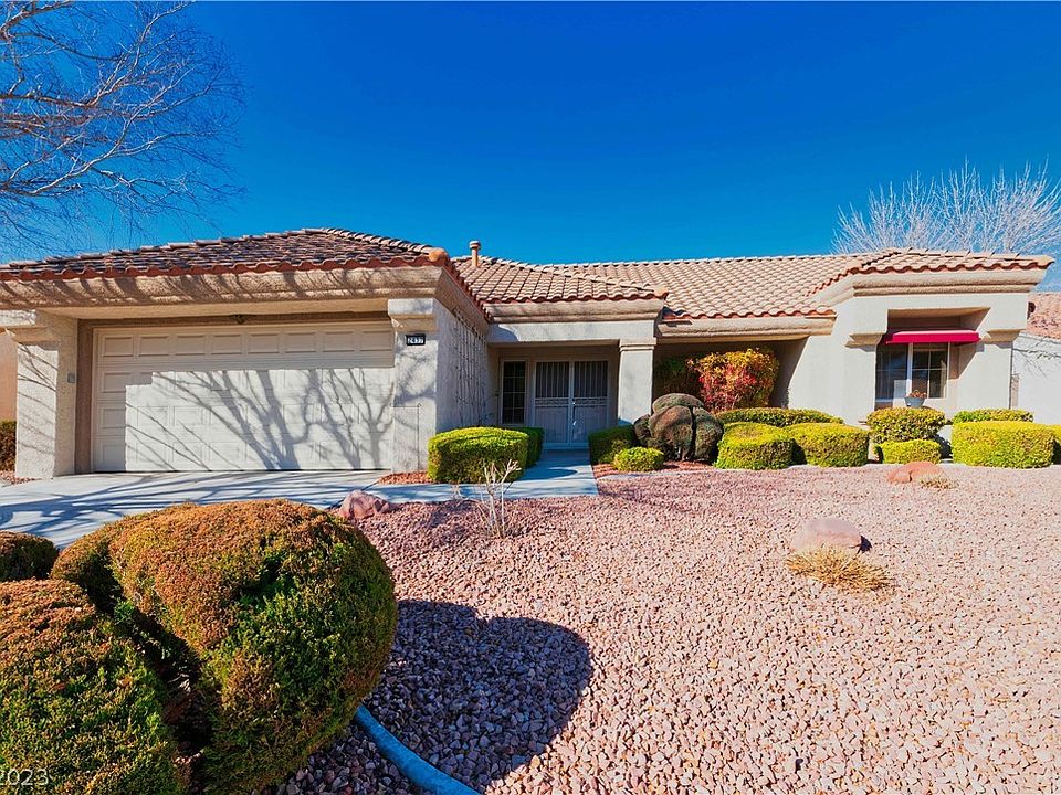 Lowest price 1,384 sq. ft. Sandalwood model in Sun City Summerlin! This popular 2 bed, 2 bath home is well located in the community. Stately double door entry leads to generous living/dining room combination space with cathedral ceilings and sliding door that leads to the covered patio. Large kitchen with refinished cabinets, butcher-block counters and a bay window enhanced eat-in nook. Entire home has well placed windows to allow plenty of natural light. Interior laundry room has sink. Primary ensuite features cathedral ceiling, a walk-in closet and roomy bathroom. Secondary bath has walk-in shower. 2-car garage has storage cabinets. Sun City Summerlin is Premier 55+ golf cart allowable community with 3 Golf Courses, and many amenities including 4 indoor/outdoor pools, work out facility, tennis and pickle ball courts, social clubs and activities galore! Nearby Downtown Summerlin with dining, shopping and a