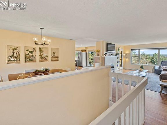 Updated Mid-century ranch with main-level living and a walkout basement in Skyway Park, on a private tree-lined lot with city-light views from inside the home and outside on the large deck. Inside, a light-filled living room has expansive windows and warm wood floors that flow into the dining area. A double-sided gas fireplace anchors the space, and the in-ground front fountain creates a relaxing welcome. The updated kitchen is designed for entertaining with an 8-foot butcher-block island, stainless steel appliances, gas range, dual pantries, coffee station, custom-painted cabinets, and a tile-mural backsplash. Walkouts from both the kitchen and living room open to a low-maintenance composite deck with built-in lighting, ideal for outdoor dining and entertainment. The main-level primary suite offers one-level living with a large walk-in closet, dual vanities, jetted tub, walk-in shower, and generous storage. On the walkout lower level, there is a spacious family room with a wood-burning fireplace, a private guest suite with its own bath, and a flexible bonus room currently used as a gym and art studio that could function as additional bedrooms, a home office, or hobby space. Outside, enjoy a fenced landscaped backyard with raised organic garden beds, a lower patio, newer shed, and wildlife sightings. Practical updates include a brand-new Class 4 impact-resistant roof, gutter guards, newer furnace, newer laminate wood floors on the lower level, central A/C, and an oversized 2-car garage with epoxy floor and workshop area. This Skyway Park view home offers mid-century character, modern updates, main-level living, a walkout design, and nearby trail access to Bear Creek Regional Park and Dog Park in desirable Cheyenne Mountain School District 12. Nestled in the foothills of Cheyenne Mountain, this spacious home combines mountain serenity with close-in convenience to the Broadmoor, Cheyenne Mountain Zoo, Old Colorado City, and downtown.