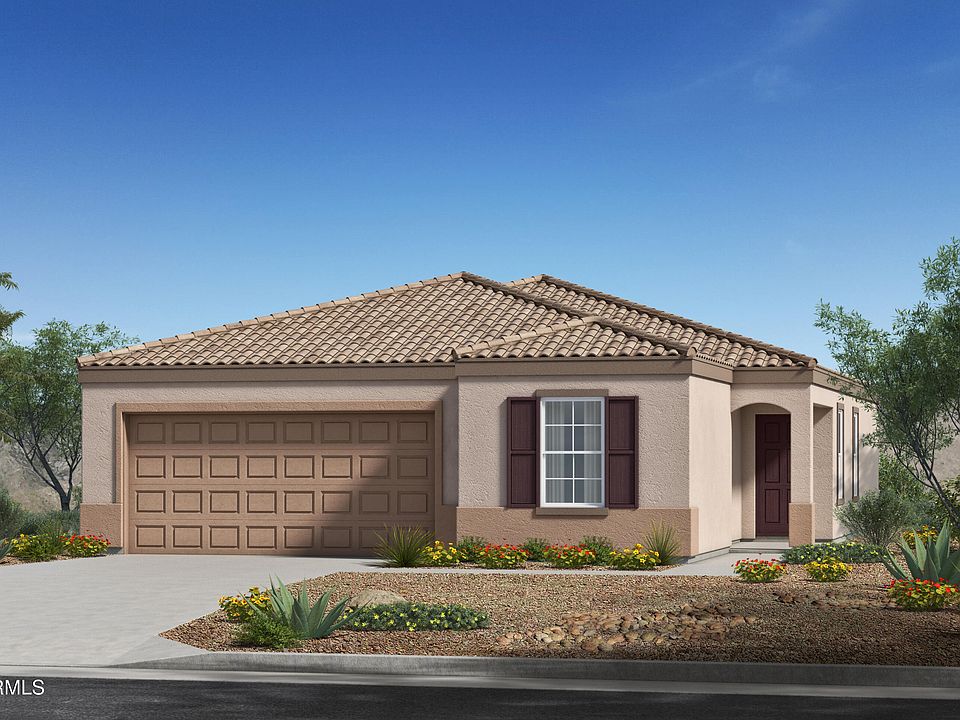 This single-story home seamlessly combines functionality and comfort, featuring 9-ft. ceilings and a spacious great room that opens to a covered back patio. The modern kitchen boasts 42-in. upper cabinets, stunning quartz countertops, a large center island with pendant light prewiring, and sleek Whirlpool® appliances. Emser® tile flooring spans the great room, kitchen, and bathrooms, while each bedroom has stain-resistant Shaw® carpeting. The primary bath features a walk-in shower, dual-sink vanity, and oversized closet. Additional features of this energy efficient home include a 40-gal. water heater, soft water loop, ceiling fan prewiring in that great room and bedrooms and an A/C system Wi-Fi-connected ecobee smart thermostat for added convenience and comfort.