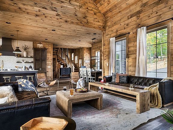 - **Layout:** Open-concept great room with soaring ceilings, massive windows flooding in natural light, gourmet chef's kitchen (pro gas range, SS appliances, island bar), and 8-person dining. Lower-level game room with 75" 4K Roku TV, pool table, 60-game vintage arcade, and board games.