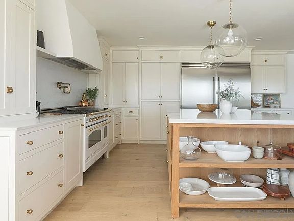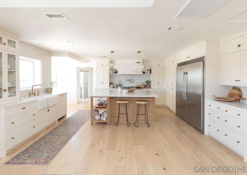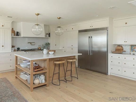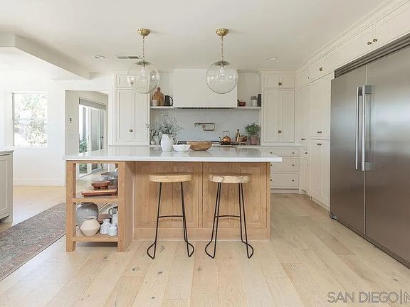 Enjoy stunning 360 views from this beautifully remodeled 4 bd/2.5 ba home set on 5.73 acres with 50 Hass avocado trees, abundant fruit trees (including Blanco grapefruit, orange, tangelo, Meyer lemon, sweet lemon, fig, kumquat and plum), an award-winning infinity edge pool & spa, built-in garden beds, an outdoor kitchen/entertaining area with a built in BBQ, pizza oven and outdoor sink, in-ground trampoline and more! Extensively and meticulously remodeled, the interior features a gorgeous open kitchen with beautiful custom cabinets and a white oak island, Bosch dishwasher, 48” Hallman range, 66” Frigidaire Professional Series side-by-side fridge/freezer, stylish Kallista unlacquered brass fixtures, engineered wide-plank white oak flooring and durable quartz counters. The primary suite features a walk-in closet, a soaking tub with views, a gorgeous dual vanity with marble countertops, along with stylish Clé tile and Kohler fixtures. In the summer, utilize the whole house fan to cool the house in the evenings, or use the dual-zone AC system. In the winter, cozy up to the two fireplaces in the living room, and family room. The spacious laundry room is a real stunner, with plenty of built-in storage.