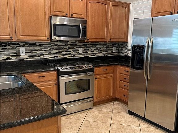 Bright kitchenBackyard fenceStainless steel appliancesEasy to maintain landscapingMaple cabinetsBreakfast barCorner lot