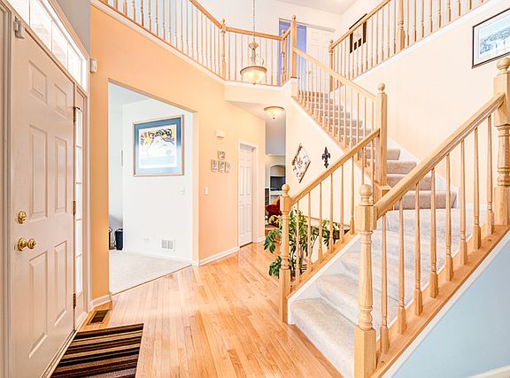 Beautiful 4 bedroom home in the Blackberry Crossings neighborhood located near schools, shopping, & parks. Great features in the home include: 2-story entryway; custom Hunter Douglas no-dust blinds throughout house; whole house humidification system, brand new water heater & AC Unit. Furnace includes HEPA filter to reduce to reduce dust; formal living & dining room spaces, 1st floor office & laundry rooms; wood laminate flooring, crown moldings, vaulted & cathedral ceilings; kitchen includes beautiful cherry cabinets, island, table space, pantry closet & appliances; fireplace in family room; master bedroom suite with walk-n closet, private bath with soaking tub and separate shower; 2nd floor includes 3 other spacious bedrooms, another full bath and loft; finished basement rec room includes pool table, sofa, chair & table; stereo surround sound system in basement & family room; 2 car garage has sealed concrete easy clean floor. Make an appointment to see this home in person today!