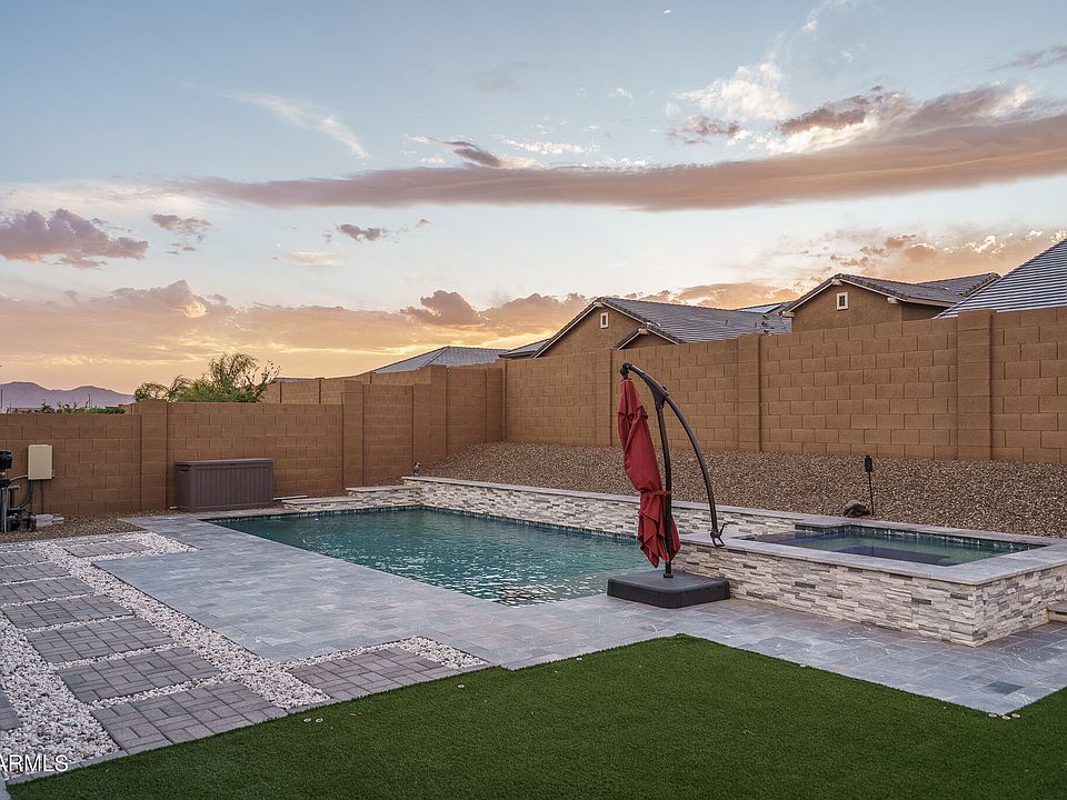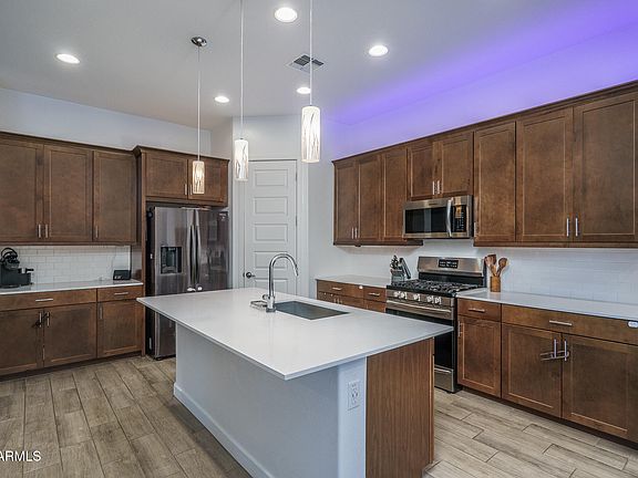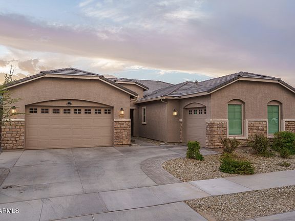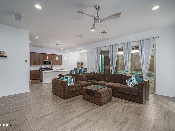 This beautifully maintained, original-owner single-level residence in the sought-after Asante community offers 5 spacious bedrooms and 3 well-appointed baths across 3,024 square feet of thoughtfully designed living space. The popular Evolution floor plan includes a versatile next-gen suite, complete with its own living area, fully equipped kitchen, private bedroom and bath, and laundry hookups discreetly tucked into a walk-in closet—perfect for multi-generational living or guest accommodations. The main home showcases an expansive great room and a chef's kitchen featuring shaker-style cabinetry, gleaming Quartz countertops, a classic subway tile backsplash, stainless steel appliances, a walk-in pantry, and a generous island with breakfast bar and pendant lighting. Sliding glass doors from both the great room and dining area open to a covered patio that overlooks a stunning heated Pebble Tec pool and spa, accented with stacked stone and surrounded by elegant paver decking. The backyard is designed for low-maintenance enjoyment, with artificial turf ideal for children and pets, plus a private patio off the casita living room for added relaxation. The luxurious primary suite boasts an en-suite bath with dual vanities, framed mirrors, an oversized tiled shower with bench seating, and a spacious walk-in closet. Guests will appreciate the extended vanity and tiled tub/shower combo in the secondary bath. Additional highlights include a split 3-car garage with an EV charging port and access to fantastic community amenities such as pools, playgrounds, and a charming lending library. Convenient proximity to the 60 and Loop 303 for commutes around the Valley.