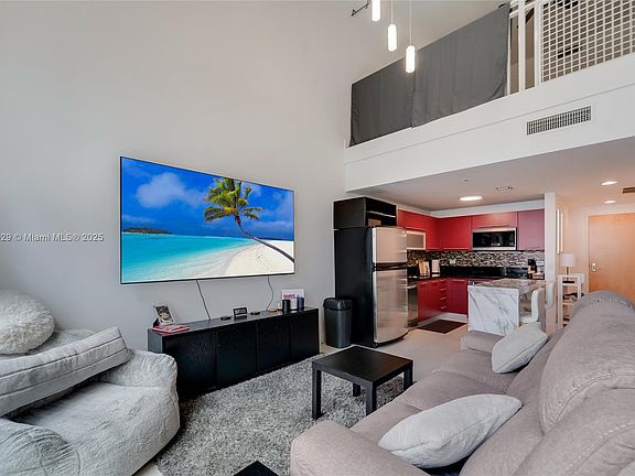 Very nice two-story loft; 1 Bedroom, 1 Full Bath upstairs 1/2 Bath downstairs with 18' floor to ceiling windows; Lounge in the tropical pool while your friends enjoy a massage at the spa or a drink at the wet bar. Building is located directly in front of BAYSIDE; Amenities include: 2 Pools, pool table, media room, conference room, Wi-Fi lounge, running track.