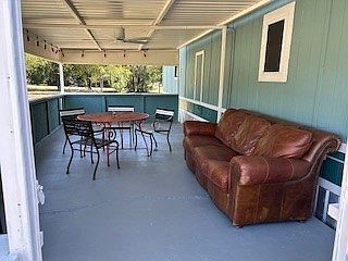 Shade treesNew refrigeratorCovered patioNew countertopsLots of kitchen cabinetsAccent wood wallsOutdoor rated ceiling fan