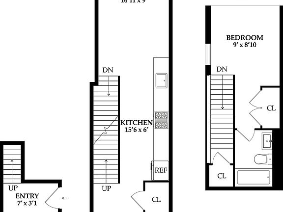 This apartment is an extremely unique 1BR triplex loft in the heart of Midtown East on 51st Street between 2nd and 3rd Avenue. The included floorplan outlines the exact layout and measurements. 1st floor- entry foyer 2nd floor- kitchen and living room 3rd floor- bedroom and bathroom Features include: -Spacious living room area with double height ceilings (16'10). -Two large windows in the living room bringing in bright sunlight -Queen sized bedroom area on the upper level with 7'10 ceiling height. No ducking or bending! -Renovated kitchen with ample pantry and counter space -Two large closets, one upstairs and one downstairs -Pets ok (larger dogs or certain breeds are case by case) -2 flights up The building is located on a tree lined block with great establishments in the area such as Stags Head, Cornerstone, Wild Ginger, Clinton Food Hall, The Smith, Crave Fishbar and many others. You can also relax at Greenacre Park which features an amazing waterfall (pictured). It's also within very close proximity to the 6 train at 51st/Lexington, the E and M lines at 53rd/3rd and Grand Central Terminal.