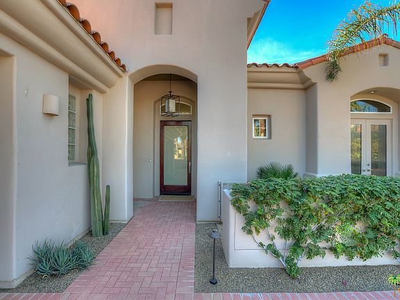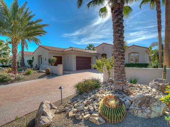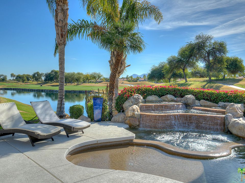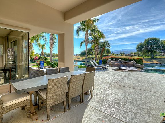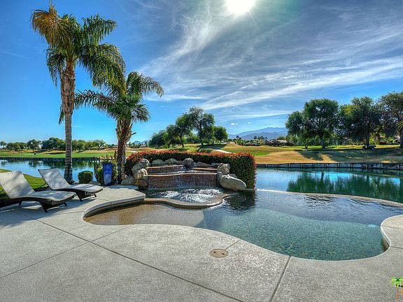 Back On Market! Located on one of the largest lots with panoramic south facing fairway, lake and mountain views, this highly upgraded 3 bedroom, 3 bath single family beauty offers a luxurious level of living. Property boasts high ceilings, walls of glass, tile floors, slab granite counters, custom lighting and window and wall treatments, including a stunning rock fireplace wall in the great room. Custom designer upgrades include bathroom cabinets, counters, sinks and showers, custom 5 panel interior doors and motorized black out shades in master. The backyard has a free form, Pebble-Tec infinity edge pool and raised waterfall spa with mature palm trees that perfectly frame your view of the lake and golf course. Large garage with epoxy floors and evaporative cooling unit, and alarm system completes the package. Offered partially furnished per inventory. A MUST see property at Mission Hills CC.