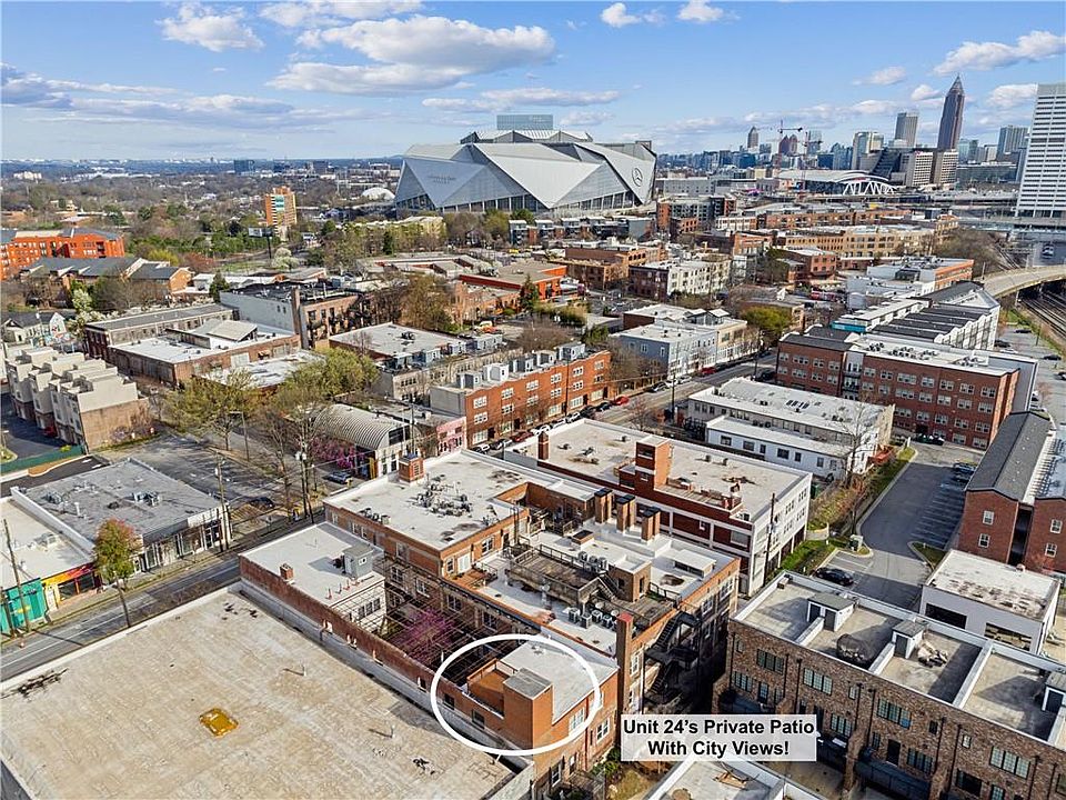 Fully renovated, bright and airy top-floor, corner home with a PRIVATE roof-top patio with city skyline views! This home includes one bedroom with a separate office/gym space. The entrance to this property has a private staircase and entrance located off the building’s whimsical interior courtyard. Entering the home, you are met with a light-filled living room and open kitchen. The designer kitchen was thoughtfully created and finished with beautiful granite countertops, matching stainless-steel appliances, custom porcelain subway tile backsplash merging with the original exposed brick wall, a wine fridge, and plenty of cabinetry. All top-of-the-line, custom finishes. The bathroom features a custom iron and fogged glass pocket door, granite vanity with matching floating granite shelves, wall-mounted sink faucet, frameless glass walk-in shower, and two shower heads including an overhead rain shower. The private roof-top patio, exclusive to this unit only, located up the spiral staircase cannot be missed; it’s an entertainer’s dream. Enjoy cocktails and views of the city and Mercedes Benz stadium. Additional unique features in the home include one deeded, covered, gated parking; in-unit laundry room; and wood-slatted, 13 ft ceilings. Enjoy the lifestyle this active community affords, with easy access to shops, restaurants, and neighborhood festivals. This area is a haven for outdoor enthusiasts and a hub for cultural events.