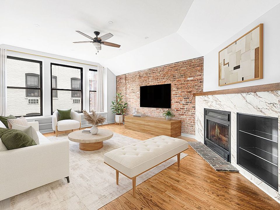 Offering high ceilings that soar to over 10-feet, big, quiet, sun-splashed rooms, two newly-redone full baths, exposed brick, a wood-burning fireplace and central ac, this is the fresh and inviting, upgraded residence that feels like a real house — a real home.
