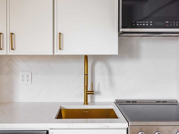 Modern studiosWide plank engineered floorsSleek stainless steel appliancesWhite carrara marbleToscana ceramic tilingModern kitchenMyora gold quartz counter-tops