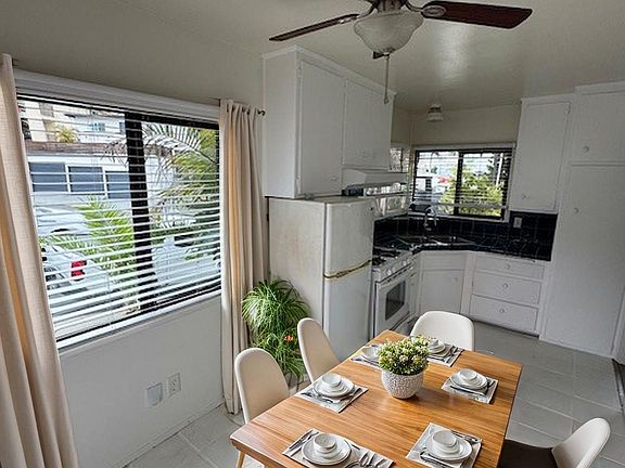 Beachside viewsLarge windowsSleek laminate flooringCozy kitchen
