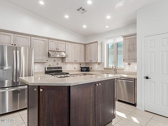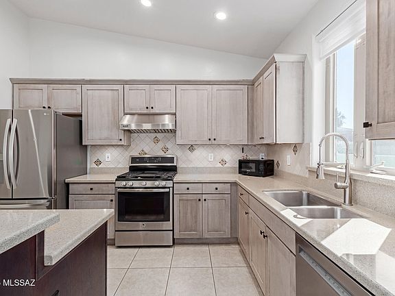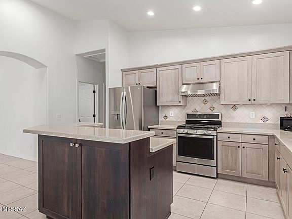 Become the proud owner of this coveted corner lot property in beautiful Rancho Vistoso! This stunning 4-bedroom home features a split floor plan offering privacy and comfort for all. Enjoy a 3-car garage with ample storage and epoxy flooring. Inside, discover soaring vaulted ceilings, abundant natural light, durable tile flooring, and energy-efficient LED lighting throughout. The gourmet kitchen showcases granite counters, wood shaker cabinets with crown moulding, recessed lighting, a tile backsplash, stainless steel appliances, and a two-tier island with a breakfast bar. The main bedroom includes double French doors leading to the backyard, an ensuite with dual sinks, and a walk-in closet. The second bedroom offers a bonus full bathroom--perfect for guests or multi-generational living. Recent upgrades include a new roof, AC units, water heater, electric pool heat pump, and Pentair pool automation, providing added efficiency and year-round enjoyment. The enchanting backyard boasts a covered patio, pavers, pristine artificial turf, mature landscaping, and a refreshing oasis pool. Make it yours today!