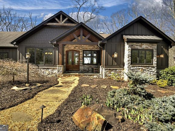 **Timeless Mountain Luxury!** 5 Bedroom/5 Bath Lodge-Style Retreat in *The Hemlocks*, privately set on 5 acres with long-range MOUNTAIN VIEWS. Inside, hand-scraped Siberian wood floors, soaring ceilings, and three stone fireplaces with black walnut mantels showcase extraordinary craftsmanship, while the chef's kitchen boasts custom knotty alder cabinetry, exotic granite, high-end appliances (including a brand-new refrigerator), pot-filler, and walk-in pantry. A spacious dining area with oversized windows and a dramatic stone accent wall creates an inviting gathering space. ALL BEDROOMS ARE EN-SUITE, including the main-level primary with dual closets, spa-like bath, and private access to the screened porch with outdoor fireplace. The finished terrace level offers a family room with fireplace, second kitchen, game area, 2 guest suites, plus a 5-seat home theatre wired for 9-channel surround (also designed as a safe room). Upstairs features a private guest suite and a huge bonus room with wet bar. Outdoor living abounds with 790+ sq ft of decks/porches plus a screened lounge with fireplace. Extras include a 4-car garage with EV charger, generator, water filtration system, private well with new pump, fiber internet, and 3-zoned HVAC. A gentle babbling brook adds charm to the wooded acreage. (Adjacent 5 acre lot is available for additional cost.) *The Hemlocks* is a hidden gem-an intimate gated community of only 20 estate lots (5+ acres each), known for big views, pristine privacy, and one of the most scenic drives in Ellijay along Turniptown Road as it meanders alongside Turniptown Creek. This home is just 15 minutes to town yet you will feel worlds away, with hiking and mountain adventures right outside your door. No STRs.