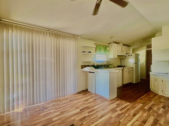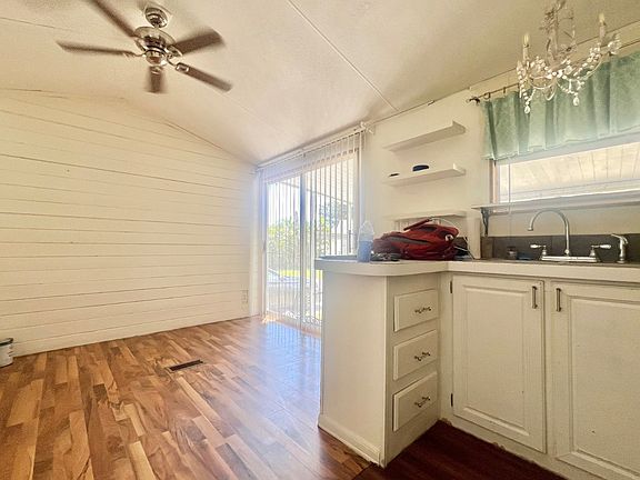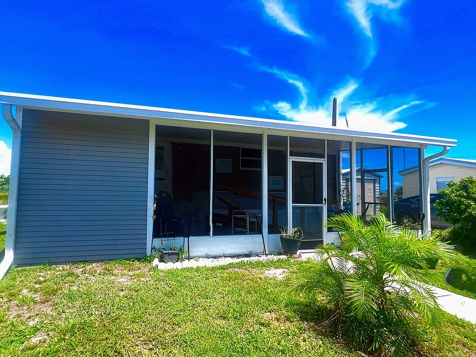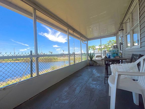Move-in ready 1 bedroom, 1 bathroom 1991 Fleetwood manufactured home located in the desirable 55+ Riverview MHC & RV Resort in Melbourne, Florida. This home features 409 sq. ft. of open living space with abundant natural light, a metal roof installed in 2023, a new water heater in 2024, freshly painted kitchen and living room, and laminate flooring throughout. The screened front porch, completed in 2023, includes an attached laundry room, while the enclosed back porch, finished in 2020, overlooks a peaceful pond. The kitchen offers a convenient breakfast bar, and the living room includes built-in storage. The bedroom features double sliding closet doors, a built-in dresser with a mirror, and a ceiling fan. The bathroom includes a zero-entry shower with updated lighting and fixtures. Additional features include an 8x10 storage shed and one dedicated parking space. Riverview MHC & RV Resort is a privately owned 55+ community with tree-lined streets and friendly neighbors, located directly across from the Indian River. The community is close to parks, shopping, dining, downtown Melbourne, Cocoa Beach, Port Canaveral, Orlando International Airport, and Disney, with easy access to public transit and major highways. The monthly lot rent of $744 includes access to the community clubhouse with a full kitchen, laundry room, restrooms, showers, and complimentary Wi-Fi. Small pets are welcome, and a dedicated dog walk area is available. The community also offers an on-site office, RV sites, regular social events, and a warm, welcoming atmosphere.