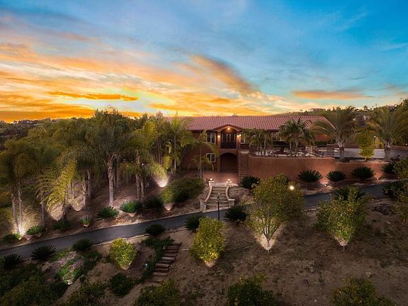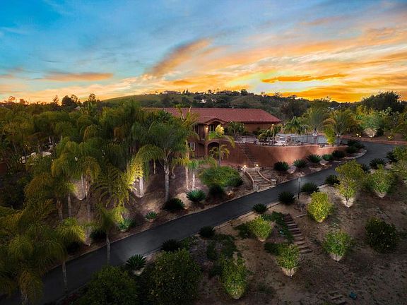 Welcome to this Gated One-of-a-Kind Los Alisos Community PRIVATE Resort Style Home. Nature preserve like setting with a seasonal stream, lined with giant oaks. Home surrounded by numerous lighted palm trees. Wrap around deck off of living room with fireplace, dining and kitchen with seating areas to enjoy the breath-taking sunsets. Enjoy indoor/outdoor lifestyle. This 3.67 acre home has it all and inside you'll find a bright spacious main level open floor plan; main level primary bedroom with en-suite and luxury shower with separate tub, large closet with access to outside. There is a second bedroom and bath on main level. Downstairs has two additional bedrooms, oversized bath, great room with fireplace and full bar and a den/game room with access to the back yard area which contains beautiful pool, spa, fire pit with seating, BBQ island, outdoor shower and numerous seating areas with panoramic views overlooking rolling hills and mountains from every spot. Pool and Home sit well above the street with a long driveway giving it complete privacy. Property has over 250 delicious citrus and exotic fruit trees. From the pool area you will find a large lighted basketball court which could be used as a tennis court/pickleball. There are 4 stables for horses with turn outs, tack/hay area as well as a large open flat area which could be used for horse arena and/or soccer field. Another unique feature of this property is a separate entry from the street to the stable area for easy access. Next to the stables is a sectioned off vegetable garden area. The 2-car plus, garage has work-shop space. Escape the crowds, ride horses, splash in the pool, play basketball or tennis and relax surrounded by the natural beauty of your Resort Retreat.
