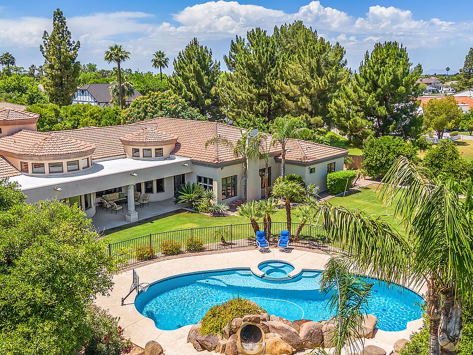 Indulge in a METICULOUSLY-CRAFTED CUSTOM ESTATE offering TIMELESS ELEGANCE in a lush citrus enclave. This AMAZINGLY ENERGY-EFFICIENT HOME is nestled in the privately-gated community of Vista Estancia, one of North Mesa's most coveted neighborhoods. Perfectly situated on a .81-acre lot, the home is surrounded by lush irrigated citrus, mature trees and features a paved circular driveway and huge grassy lot. The gorgeous back yard features an oversized north-facing covered patio with built-in speakers, and an EXTRAORDINARY FENCED POOL AND SPA, with ample room for laps, 10' deep for diving, and a stunning rock waterfall and slide. Cantera stone details embellish a high-quality colored stucco finish, and the custom entry door is timelessly elegant. Gracing over 5,600 sf of living space, interior features include limestone & travertine flooring, gorgeous Lincoln casement windows, soaring ceilings, and high-quality fixtures. Boasting the 'PERFECT' FLOOR PLAN,' the layout is appealing for many living situations. A TRUE SPLIT FLOOR PLAN, the Primary Suite occupies a separate wing of the home, with a spacious sitting room, romantic fireplace, and a well-appointed ensuite bath with abundant built-in storage and a spacious walk-in closet.