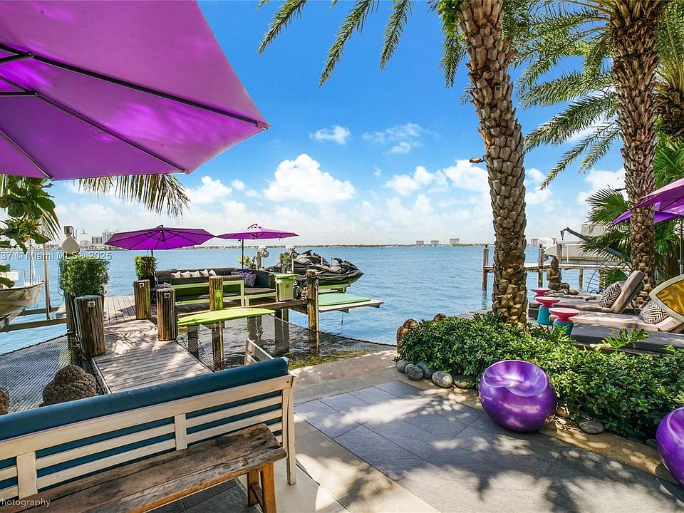 One-of-a-kind waterfront masterpiece! This unique home sits on a cul-de-sac on Normandy Shores exclusive gated community, w/ Normandy Shores Golf Club, Tennis, Basketball Courts, and Parks. Nestled on the Island's Terrace, shares w/only 6 residences breathtaking open bay views and sunsets. Built in 2015, this 3,442 SQ FT eccentric home features 4 bed/4 bath, open living and dining, state-of-the-art kitchen, and more. The home's Zen vibe begins as you step through a bamboo garden, 30 ft interior waterfall, and end at the open bay sanctuary. The backyard landscaping, shimmering pool, outdoor kitchen, and terraces make this home magic. Bath in the outdoor tub, watch movies at the two-story Tiki Hut, and enjoy the dock at sunset. Boat and Jet Ski lifts and davit. Plans for a two-car garage.