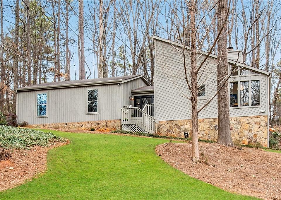 Welcome Home! Experience the perfect blend of original charm and contemporary flair in this captivating residence! Nestled atop a serene .66-acre lot enveloped by lush trees, this hidden gem offers a tranquil retreat in the heart of Roswell. The sleek, modern kitchen boasts a granite waterfall edge peninsula, new appliances, newly painted kitchen cabinets. Vaulted ceilings soar above the living and dining areas, accentuating the warm wood walls, striking stone fireplace and creating an inviting ambiance. New LVP flooring throughout, paint, and lighting throughout. Newly renovated bathrooms and brand-new front and back steel and glass doors are the finishing touches to the home. Step outside to your private backyard oasis, complete with an expansive deck ideal for outdoor entertaining with new landscaping, hardscaping, and retaining wall. Additional storage space awaits in the unfinished basement, offering versatility for future customization. Whether you desire a workout room, workshop, or extra recreational space, the possibilities are endless. Embrace the convenience of nearby amenities including riverside trails, public library, and parks, all within walking distance. This home has been meticulously updated throughout each living space and will provide a move in ready, low maintenance home for you to enjoy for years to come!