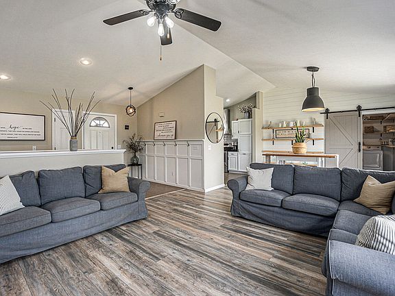 Don't miss out on claiming your home in the coveted Brownstone neighborhood! This well-maintained and recently updated ranch is situated on a quiet street, with stunning views of wildlife in an open field that adjoins the backyard. Living room includes an electric fireplace & ceiling fan for any desired climate, while showcasing a vaulted ceiling. Open concept living & kitchen have vinyl flooring throughout & are accented with white shiplap walls, a gorgeous barn sliding door to the main floor laundry/mud room, & detailed subway tile backsplash. The kitchen boasts 2-year-old stainless-steel appliances, granite counters, & a farmhouse sink! Primary bed is spacious & includes walk-in closet & private bath. Additional living space in the basement where you'll find a bedroom & a recently finished entertainment area with recessed lighting & vinyl flooring. Plenty of storage in the attached & extended 3 car garage. Roof was installed in April '23. Check it out before it's gone!
