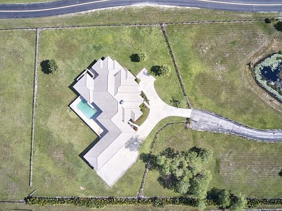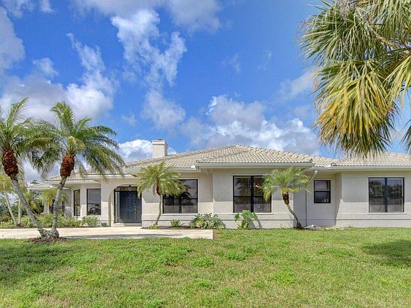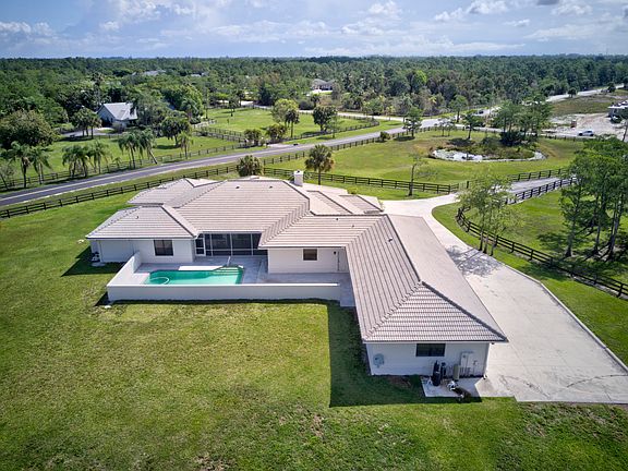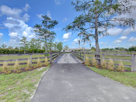 Sprawling 5000 square foot CBS Mediterranean Style house situated on five private acres. Perfect for Equestrian with plenty of room for a barn or utilize the detached two car garage for temporary barn and covered screen area for tack/wash out. Three existing fenced paddocks. Also perfect for the nature lover, no traffic noise! Paved roads, lots of horse trails, great Wellington schools, new shopping center close by and easy commute to Palm Beach Airport.Attached 3 car garage has been converted into a work room, can be easily converted back.Office, and media room could be additional bedrooms.Extremely large master suite with walk in closet. Completely gated and fenced, plus community has gate. The tree lined streets are simply beautiful. Priced below appraised value. Come see for yourself.