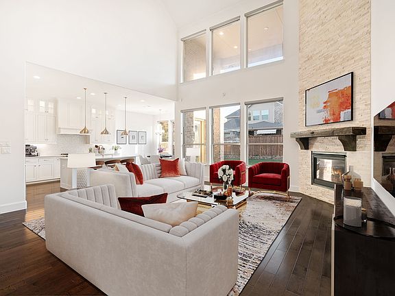 Floor-to-ceiling stone fireplaceLuxury livingRich hardwood floorsAbundance of natural lightQuartz countertopsThree-car garageCovered patio