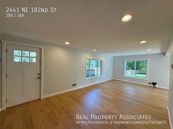 Charming three-bedroom, one-bath home in Shoreline. The spacious living room connects a dining area and kitchen, featuring marble countertops, stainless steel appliances, and ample cabinet space. A cozy den leads to two of the bedrooms and a third private bedroom. French doors open to a large deck and patio overlooking a beautifully sized yardperfect for entertaining, relaxing, or outdoor activities.