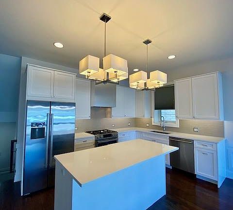 Welcome to this newer construction condo for rent in North Center/ St. Ben's. Unit offers a fantastic layout, on-trend finishes, separation of living space and bedrooms, natural light, loads of closet space, a shared garage roof deck, and garage parking. The living room is anchored by a fireplace and overlooks the tree-tops, with dramatic floor to ceiling windows. The dining area sits between the living room and kitchen, with ample room for a table and seating for 6. Beautiful kitchen offers white quartz countertops, 42" cabinets, a large island, & Bosch stainless appliances including a wine fridge and exterior vent hood. The hallway leads to the first bedroom 12x11, full bathroom and a large hall closet. The spacious master bedroom suite 16x15 features a large walk-in closet and bath with a jetted tub, separate shower, and double vanity. Unit features include high ceilings, floor to ceiling windows with lots of natural light, detailed woodwork/moldings, a gas fireplace, hardwood floors, & large coat closet as well as a large, shared garage roof deck. 1 garage parking space included in the rent. Easy access to the Irving Park brown line, CTA bus, Horner Park, restaurants, bars, & grocery stores. Renter pays for electricity, gas, and internet. $40 application fee. Must have good credit 650+. No smoking. Pets considered case by case.