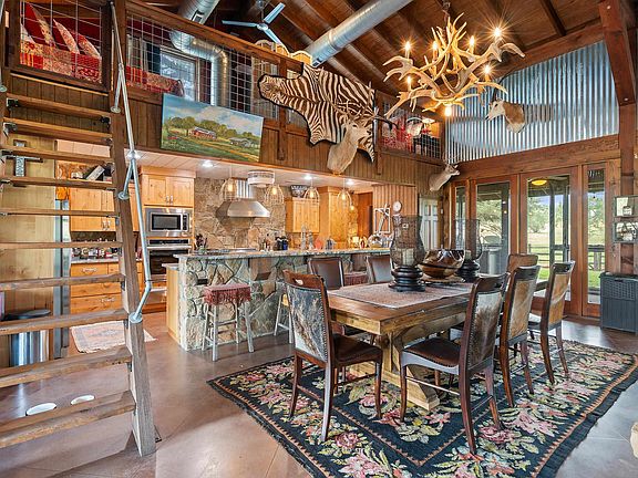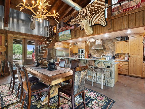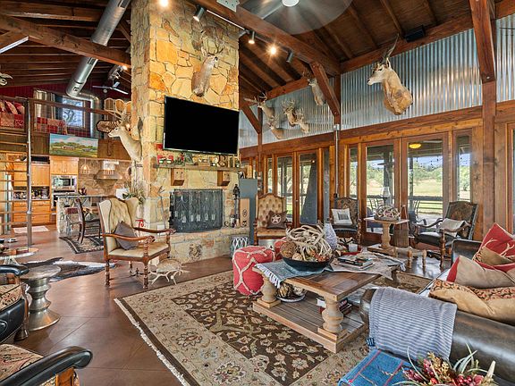 Prime Ranch location, approximately 400 +/- acres on Hwy 71, right off 2147. Multiple properties on the ranch. Unique main property with 25-foot vaulted ceilings with wraparound porches surrounded by French doors opening to hill country views. Gourmet kitchen with stainless steel appliances, dining area, loft bedroom area, several seating areas, a Party hot tub, enormous fire pit, and a three-car carport. The entire property is fenced, with several small lakes, a hunting pavilion with a half bath, electrical, and storage. Two service properties and one caretaker's home. Plus barn & greenhouse.