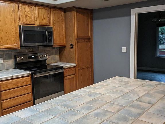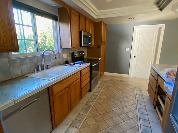 - Wet Bar, Ceiling Fan(s), Recessed Lighting, Tile Counters, Galley Kitchen