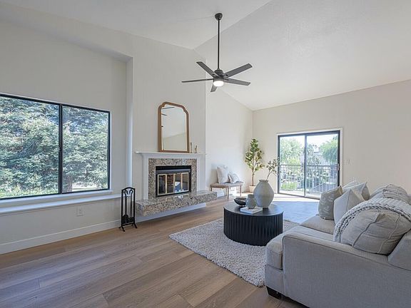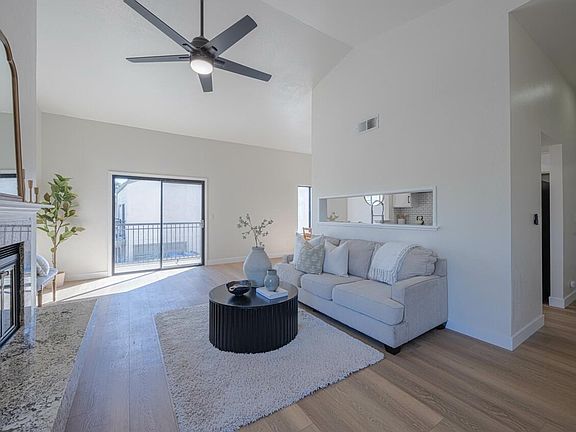 Welcome to North Village Lagoon, where this beautifully updated 1-bed, 1-bath upstairs unit combines comfort and style in a serene community setting. Step inside to vaulted ceilings in both the living room and bedroom, creating an open and airy atmosphere. The home has been tastefully upgraded throughout and is truly turn-key. Recent improvements include premium wood laminate flooring, fresh interior paint, updated baseboards, and all-new interior hardware. The kitchen has been fully remodeled with quartz countertops, subway tile backsplash, new cabinetry, and stainless steel appliances. The bathroom features a new vanity with a quartz countertop, updated fixtures, and refreshed finishes. Recessed lighting, modern light fixtures, and a sleek fireplace surround further enhance the homes appeal. Just steps away, enjoy the community pool and the tranquil water features that flow throughout the grounds. Conveniently located near major shopping centers, dining, and commuter routes, this condo is move-in ready and waiting for its next owner!