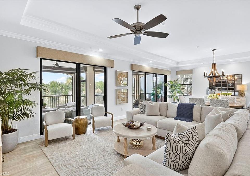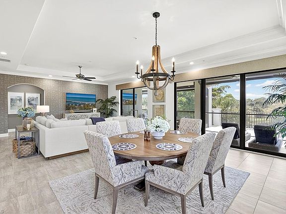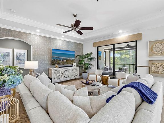 Experience Elevated Living at Terzetto in The Colony This stunning second-floor, furnished residence at Terzetto offers the feel of a spacious penthouse with a casual, yet elegant design. Tastefully decorated, the open-concept floor plan seamlessly connects indoor and outdoor living, ideal for both everyday comfort and effortless entertaining. Unique to second-floor units, enjoy a private open-air sun deck in addition to the expansive screened lanai—perfect for relaxing or taking in the peaceful, southern lake views. Every detail of this home reflects the highest level of upgrades, from the gourmet kitchen and luxurious bathrooms to premium flooring that extends gracefully onto the lanai. Custom features include remote-controlled electric shades in the great room, primary suite, and bath, as well as a built-in wine and beverage bar with wine cooler—adding a touch of sophistication to your entertaining space. Additional highlights include impact-resistant windows and doors throughout including electric storm shades on both the back and front balcony. 2-car private garage. This is a rare opportunity to enjoy refined living in one of The Colony’s most desirable communities. Amenities for Colony residents include dining at the Colony’s private and newly renovated Bay Club with unparalleled views of Estero Bay and kayak park. Pelican Landing amenities included in the HOA- private beach park with boat shuttle access from the community, tennis center, pickle-ball, bocce, attended fitness center and kayak park. Optional golf and sports memberships may be available at the Colony Golf Club and The Nest Country Club.