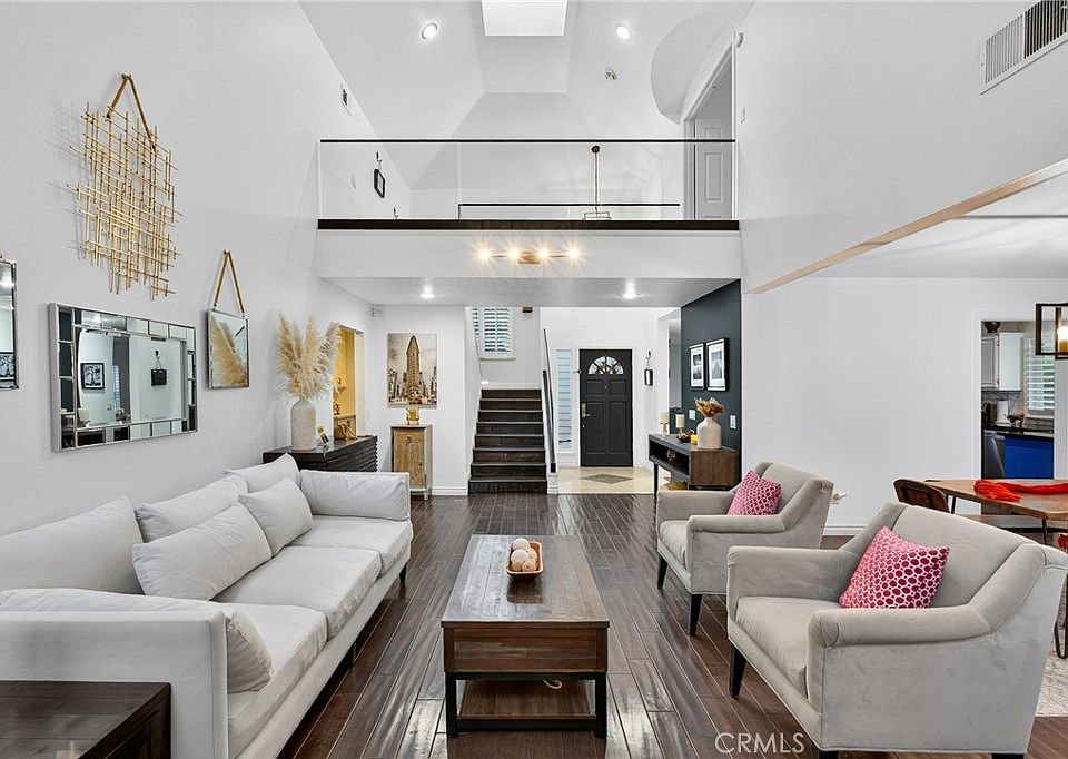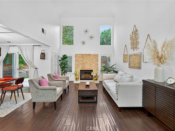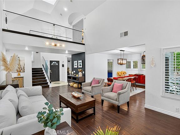 Highly sought-after Chelsea model located on a quiet cul-de-sac in the prestigious Valencia Summit. This 3-bedroom, 3-bath home spans over 2,100 sq. ft. and features a soaring two-story living room with high ceilings, rich wood flooring, and abundant natural light. The updated granite kitchen includes custom cabinetry, stainless steel appliances, gas range, and multiple spaces for outdoor dining. A formal dining room with sliding doors makes entertaining seamless. The first floor offers 2 bedrooms, 2 baths, laundry room, and ample storage. Upstairs, the primary suite boasts vaulted ceilings, window seat, and a luxurious bath with dual sinks, marble floors, soaking tub, and separate shower. Wrap-around backyard gives tons of privacy. Community amenities include pools, spas, tennis courts, clubhouse, picnic areas, and scenic trails. Conveniently close to Valencia Town Center, COC, CalArts, dining, shopping, and freeway access.