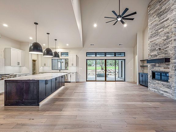 This custom-built home showcases soaring vaulted ceilings that flood the space with natural light.
