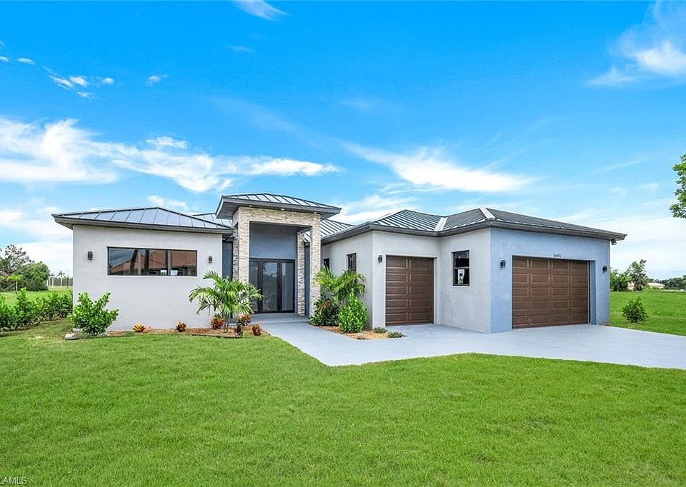 H11030. Welcome to this NEW Construction three-bedroom three-bathroom quality-built pool home boasting a spacious open plan, perfect for entertaining! The minute you arrive, your eyes are drawn from the metal roof to the bronzed frame impact windows & your 3-bay garage! As you approach the entry, the intricate stone columns & tongue & groove wood ceiling invite you inside. Walk into a view of the pool & great room accented with a tray ceiling, & modern baseboard. The two-tone kitchen, white & wood cabinets, feature soft-close doors, storage on both sides of the 6'x11.5' island and stunning white quartz countertops w/ delicate vein detail extending to your backsplash. The home has a split floor plan, pool bathroom & a laundry room. As you enter the master bedroom you notice the two walk-in closets. The grand master bathroom is filled with natural light, large frameless glass enclosed walk-in shower, accent niche, rain showerhead w/ high pressure options, gorgeous tile detail, freestanding soaking tub, dual glass vessel sinks, quartz countertop & private commode, and a linen closet ready to create an in-home spa sensation! Schedule your appointment to see this beautiful home today!
