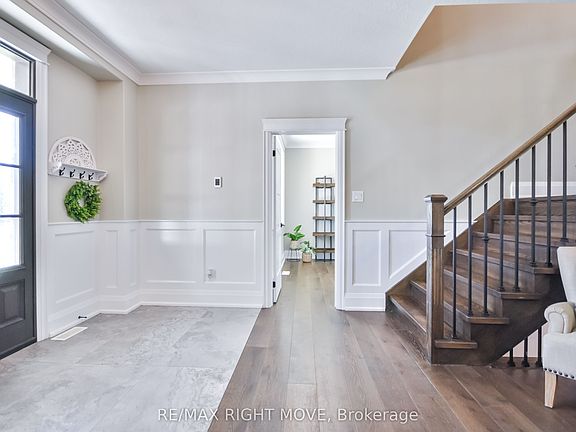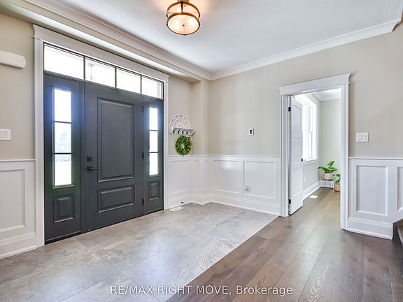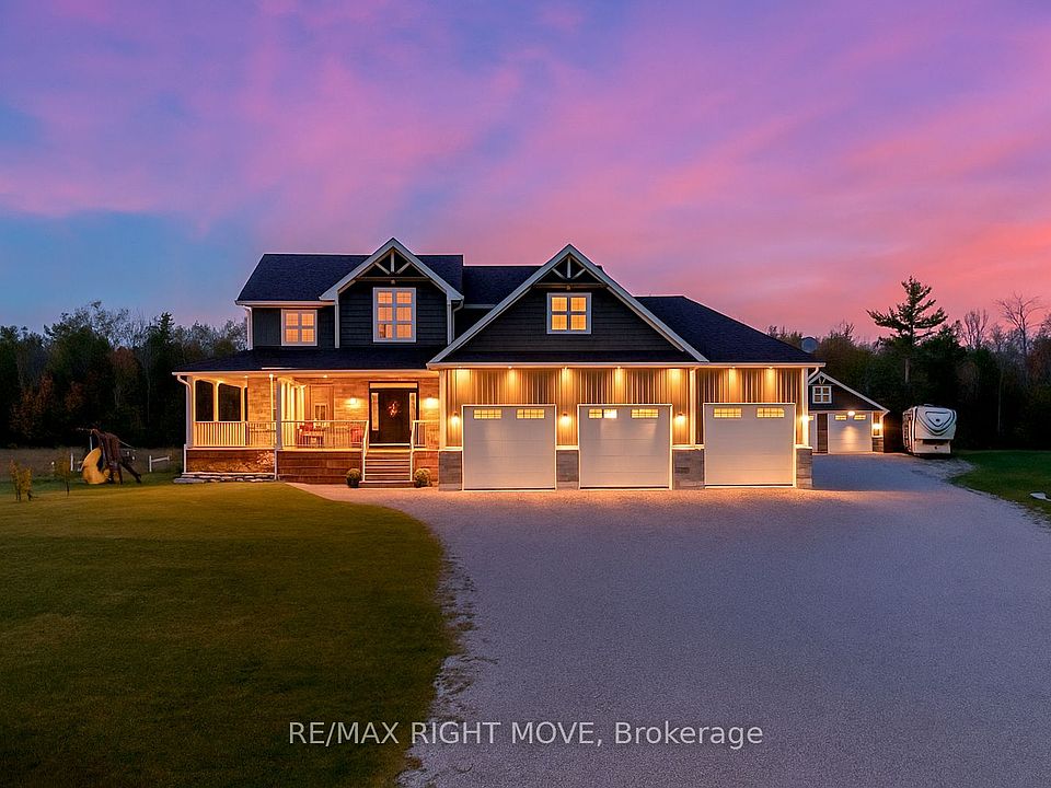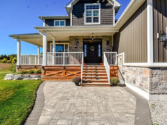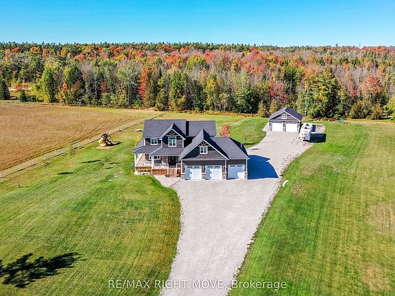 Welcome to 2448 Stockdale Road, Severn Township. Set on 4 acres, this luxurious custom-built home with wrap-around porch showcases exceptional craftsmanship and high-end finishes throughout. The main level is open, bright, and designed for modern living, featuring a stunning custom kitchen with an oversized island, quartz countertops, a 48 dual-fuel range, and a spacious family room with a stone gas fireplace. Additional main floor highlights include a private office, mudroom, elegant 2-piece bath, 9-foot ceilings, and engineered hardwood flooring throughout. The second level offers 5 generous bedrooms, including a serene primary retreat with coffered ceilings, a luxurious 5-piece ensuite with a soaker tub, dual walk-in closets, and a private sitting room. This level also features a 5-piece main bath, an additional 4-piece bath, and rich engineered hardwood flooring throughout. The finished lower level features a large, open recreation room, office, laundry area, and a 3-piece bath, all with oversized windows that bring in natural light. For the hobbyist, the triple-insulated and heated attached garage provides ample workspace, complemented by a detached heated and insulated double garage with a loft for additional storage. Notable upgrades include soffit lighting, heated tile floors, wainscoting, shiplap, coffered ceiling details, and premium trim finishes. Located just 10 minutes from Orillia or Washago, with nearby access to Lake Couchiching and the Trent-Severn Waterway, Highway 11, and endless recreation opportunities for boating, snowmobiling, and ATV adventures. An exceptional property where luxury meets country living, every detail thoughtfully designed and beautifully executed.